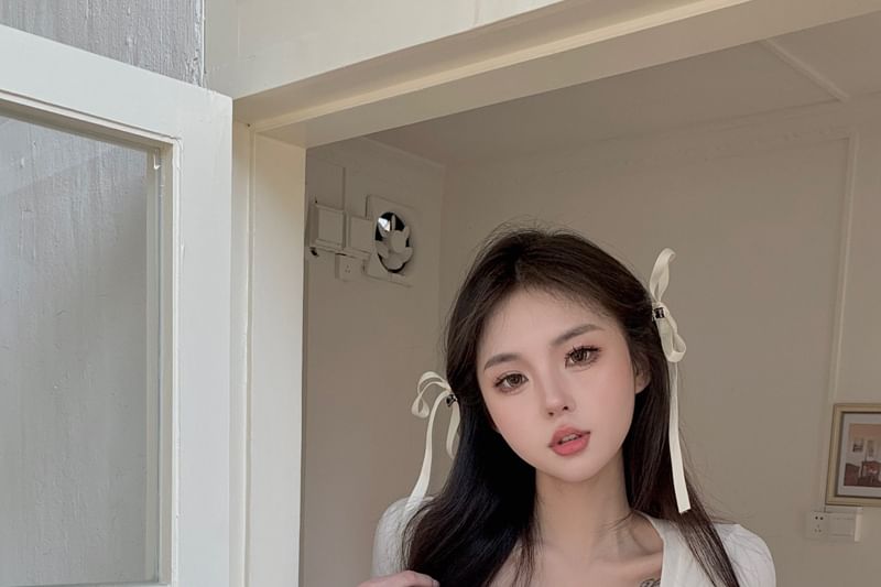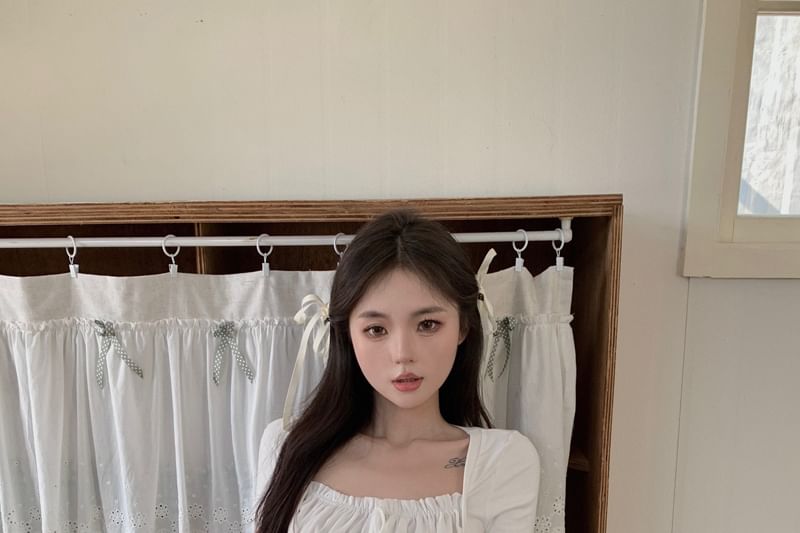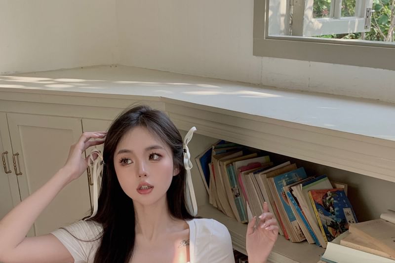 Short Sleeve Square Neck Plain Ruched Mock Two Piece Top