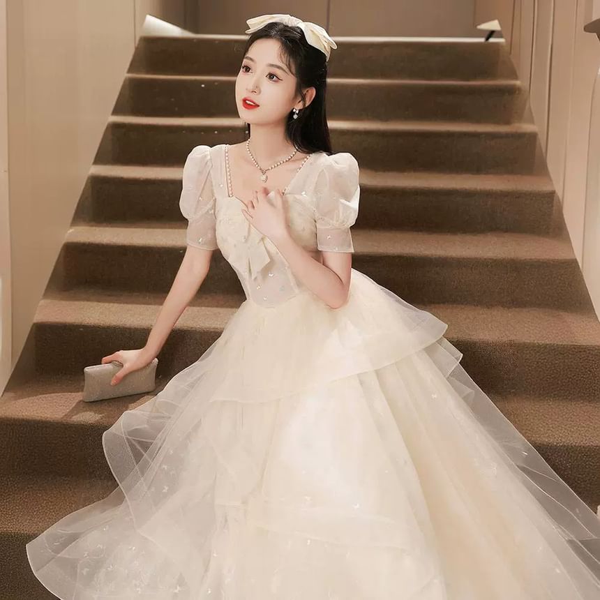 Short Sleeve Sweetheart Neck Patterned Print Bow Ruffle Mesh A-Line Evening Gown