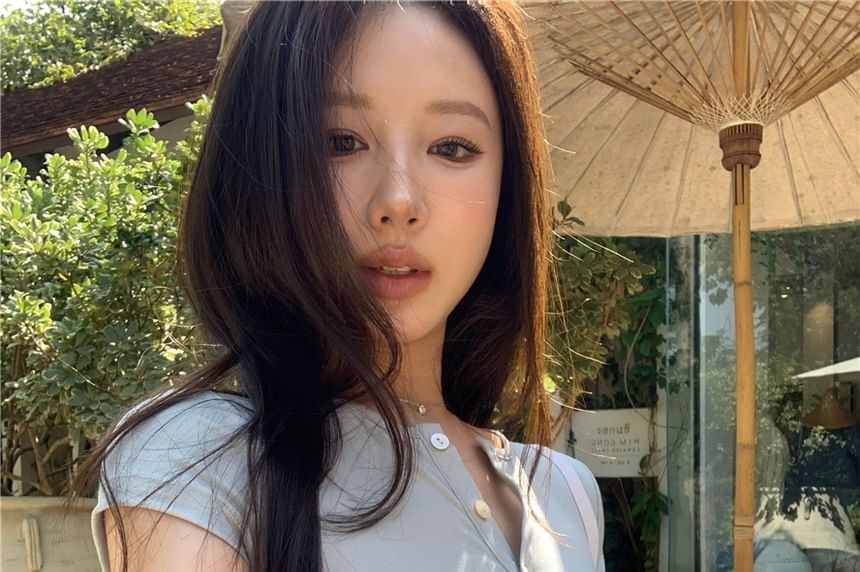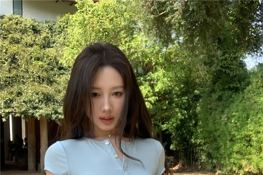 Short-Sleeve Half Buttoned Plain Crop Tee