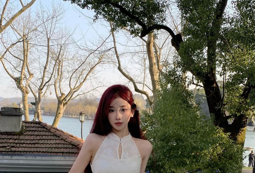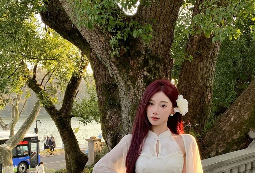 Sleeveless Keyhole Floral Maxi Qipao / Fringe Plain Shawl / Set