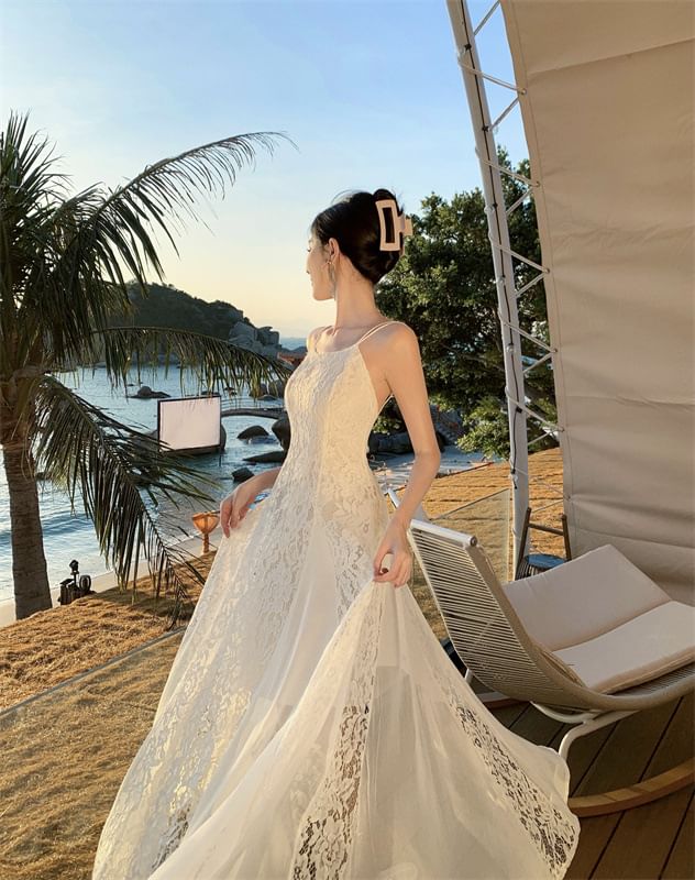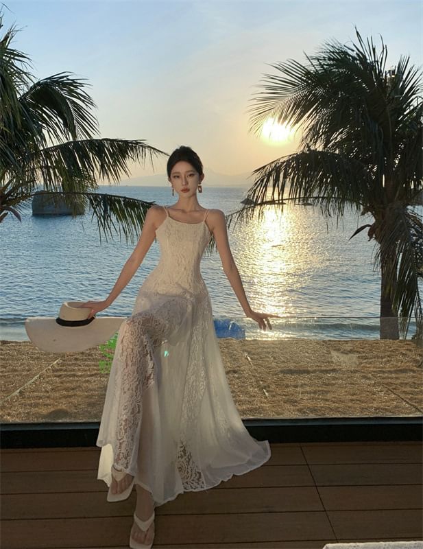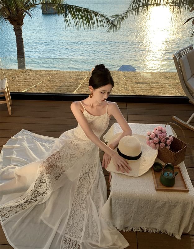 Spaghetti Strap Plain Lace Panel Open Back Maxi Sundress