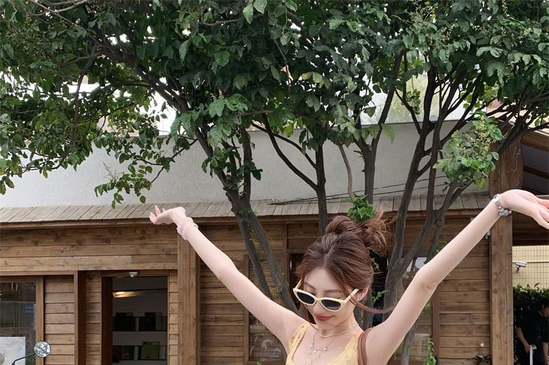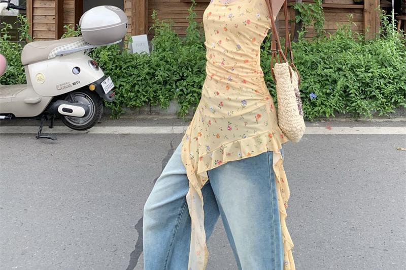 Square Neck Floral Asymmetrical Ruffle Trim Slim Fit Tank Top