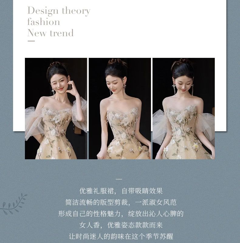 Strapless Floral Embroidered A-Line Evening Gown