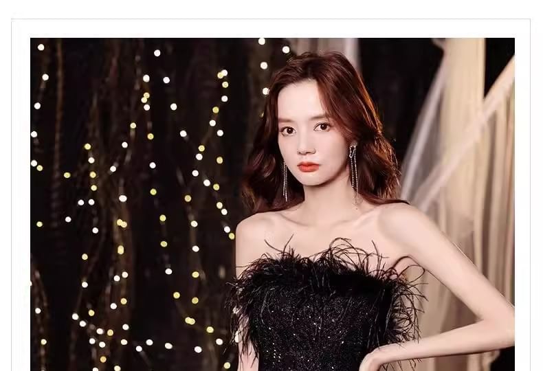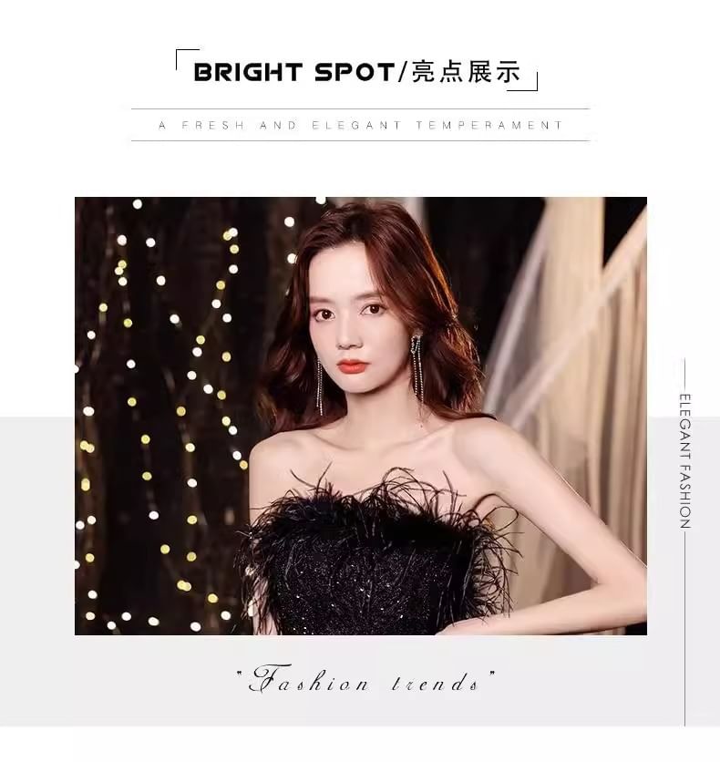 Strapless Sequin Lace Panel Feather Trim A-Line Evening Gown