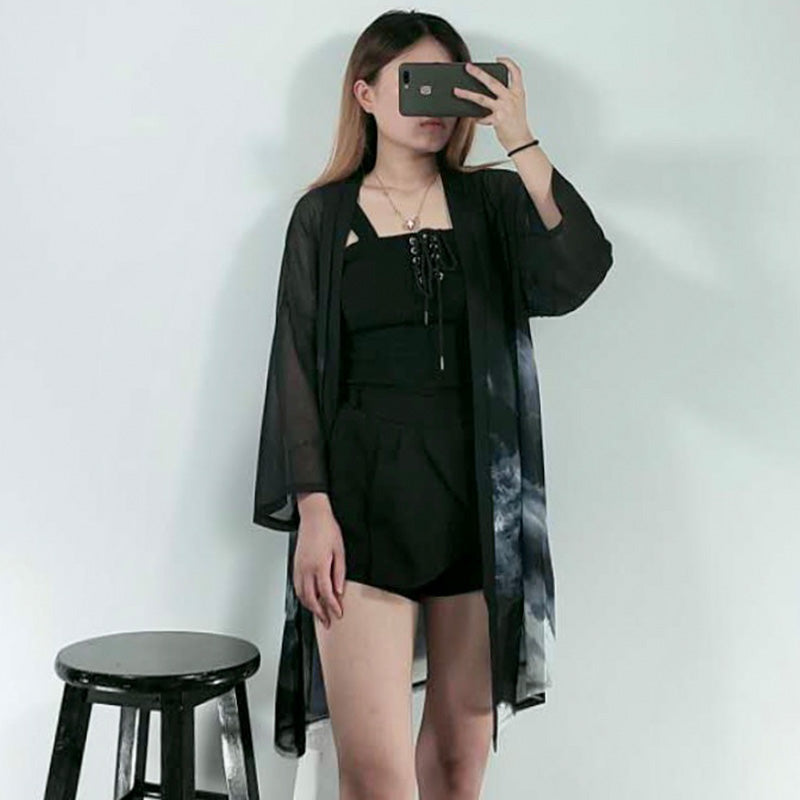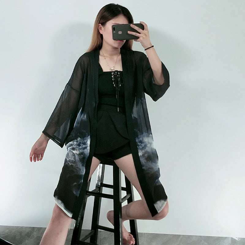 Ce kimono élégant est un mélange unique de style vintage et moderne, avec des peintures à l'encre complexes qui ajoutent une touche de sophistication à n'importe quelle tenue. Fabriqué avec des matériaux de haute qualité pour un look et une sensation luxueux. Parfait pour ajouter une pièce de déclaration à votre garde-robe et vous démarquer en toute occasion.