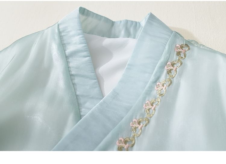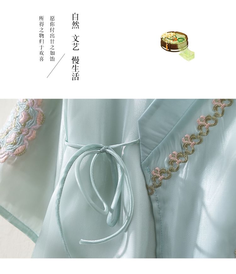 3/4-Sleeve V-Neck Floral Embroidered Tie Front Wrap Top / Elastic Waist Fringe Midi A-Line Skirt