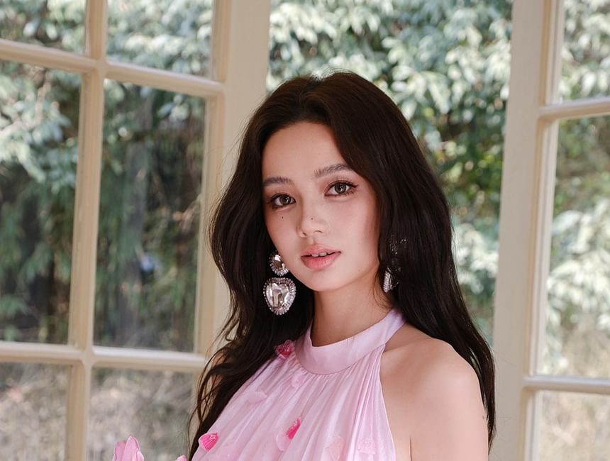 Sleeveless Floral Accent Mesh A-Line Evening Gown