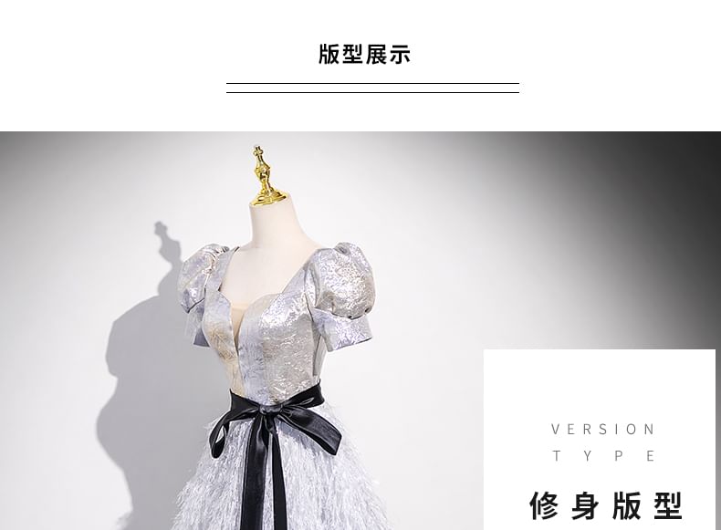 A-Line Fringe Square Neck Glitter Evening Gown Short-Sleeve
