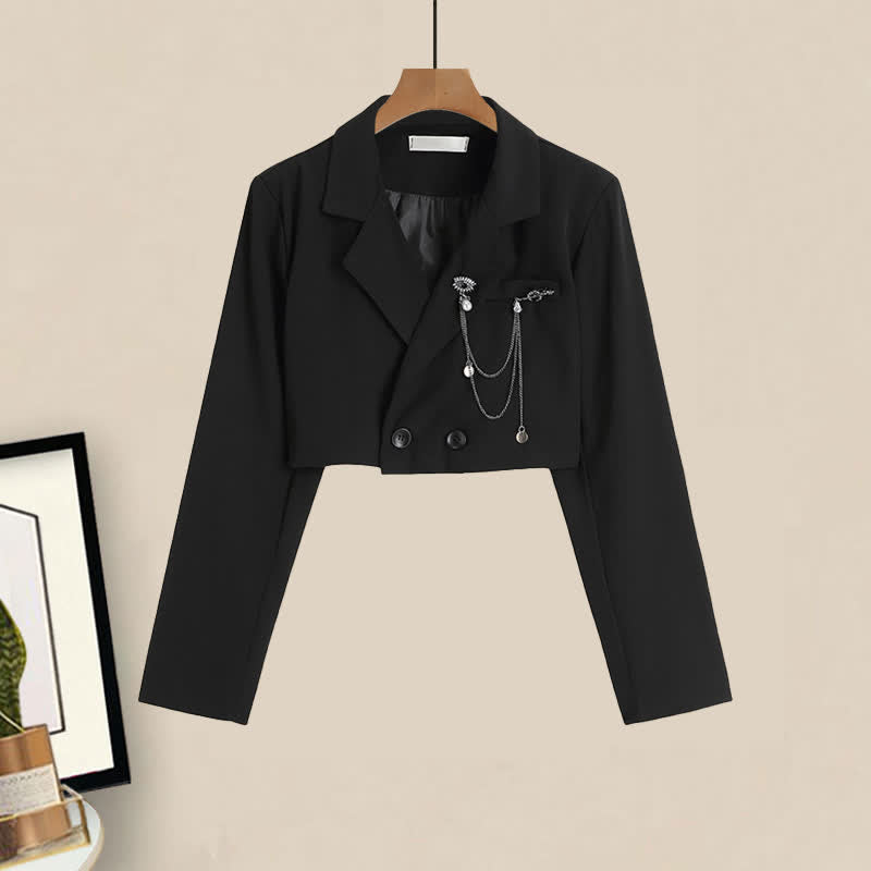This elegant Black Chain Decor Short Blazer Lace Up Irregular Slip Dress Set adds a touch of sophistication to any outfit. The unique lace up design and irregular slip dress add a stylish edge, while the black chain embellishments elevate the overall look. Perfect for those who want to make a statement with their fashion choices.