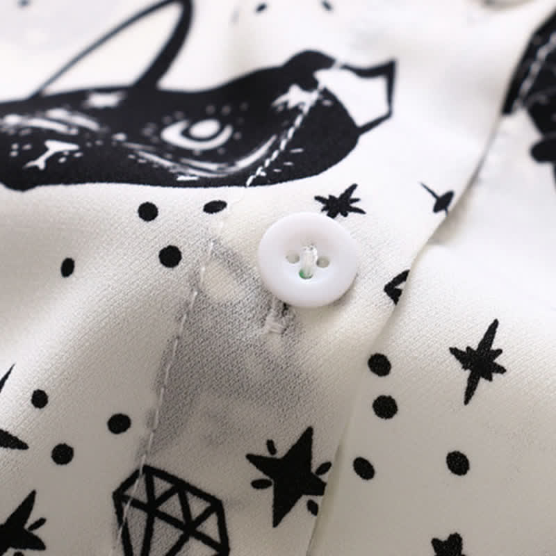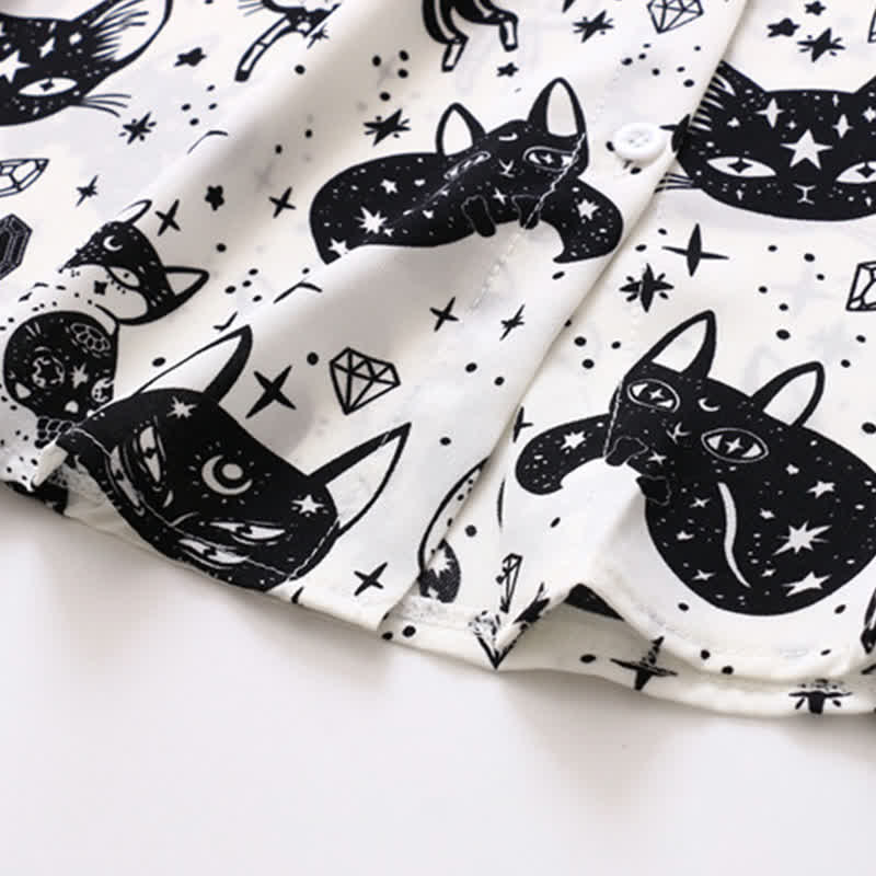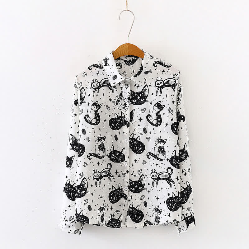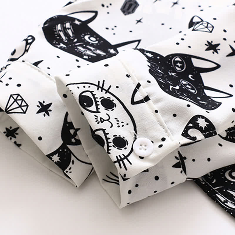 Elevate your style with our Black White Kitty Print Lapel Chiffon Shirt. Its elegant design showcases a playful black and white kitty print, perfect for the sophisticated cat lover. The airy chiffon fabric adds a feminine touch, while the lapel collar exudes sophistication. Experience comfort and style in one.
