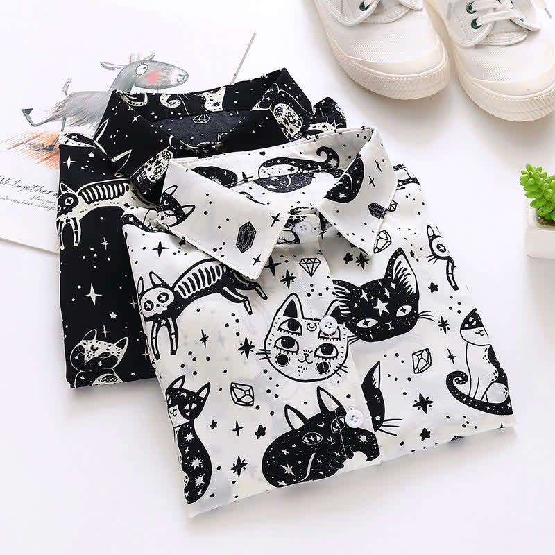 Black White Kitty Print Lapel Chiffon Shirt