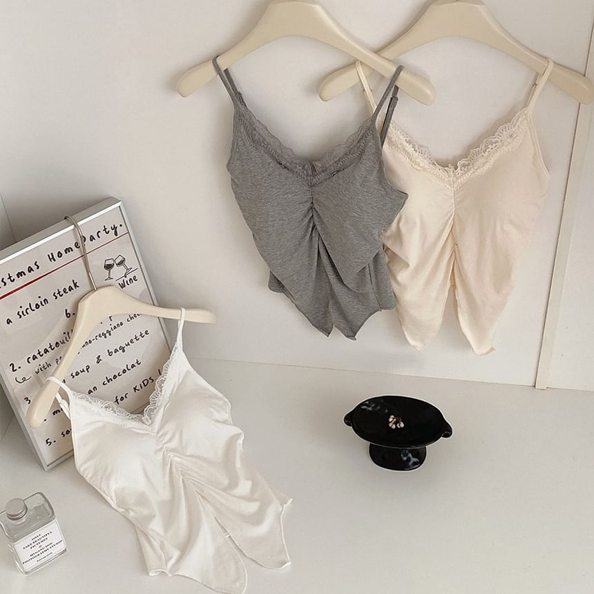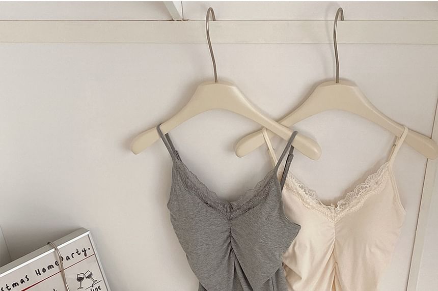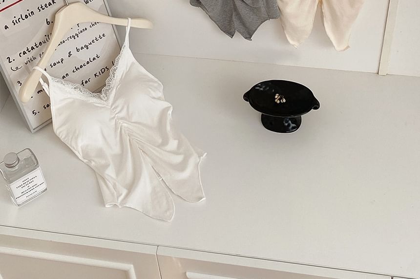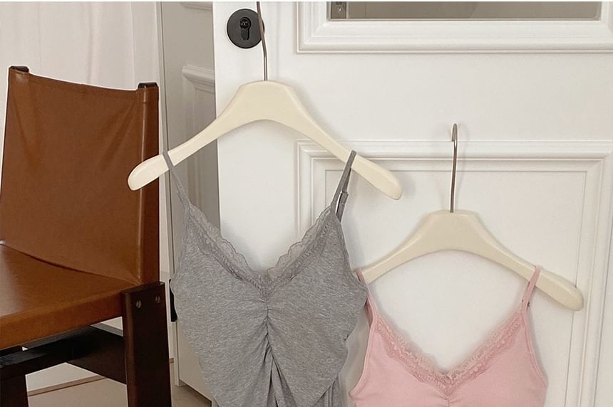Plain Ruched Lace Trim Slit Slim Fit Cami Top