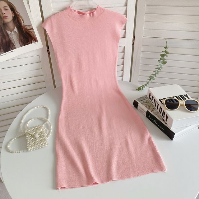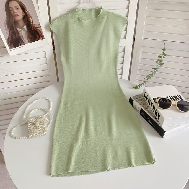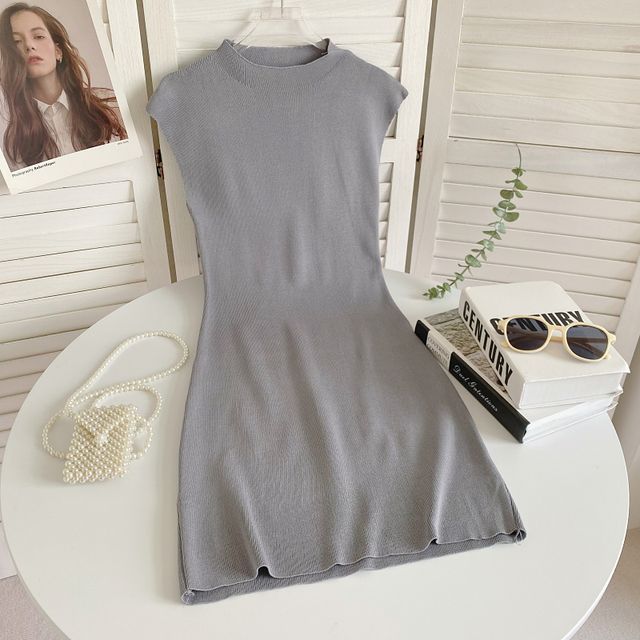 Cap-Sleeve Mock Neck Plain Knit Mini Bodycon Dress