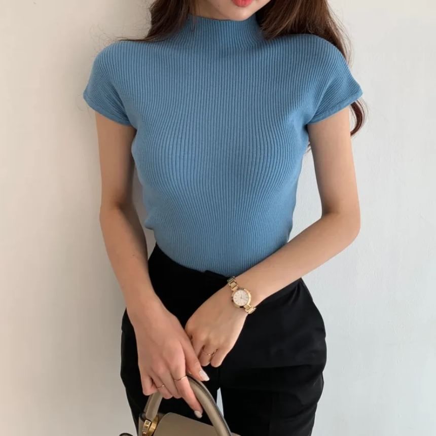 Cap Sleeve Mock Neck Plain Ribbed Knit Top