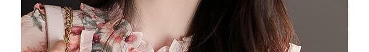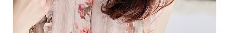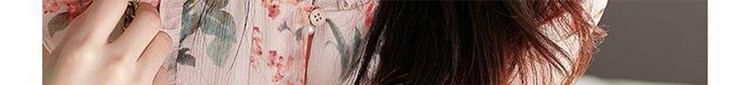 Cap-Sleeve Notch Neck Frill Trim Floral Pleated Blouse
