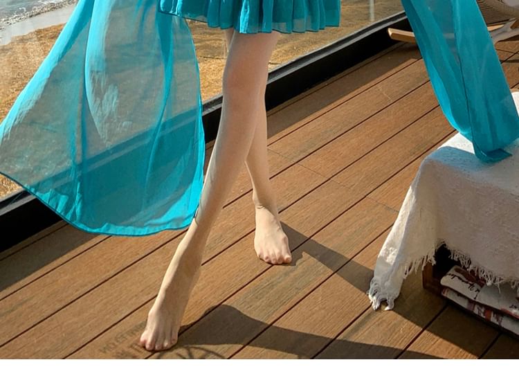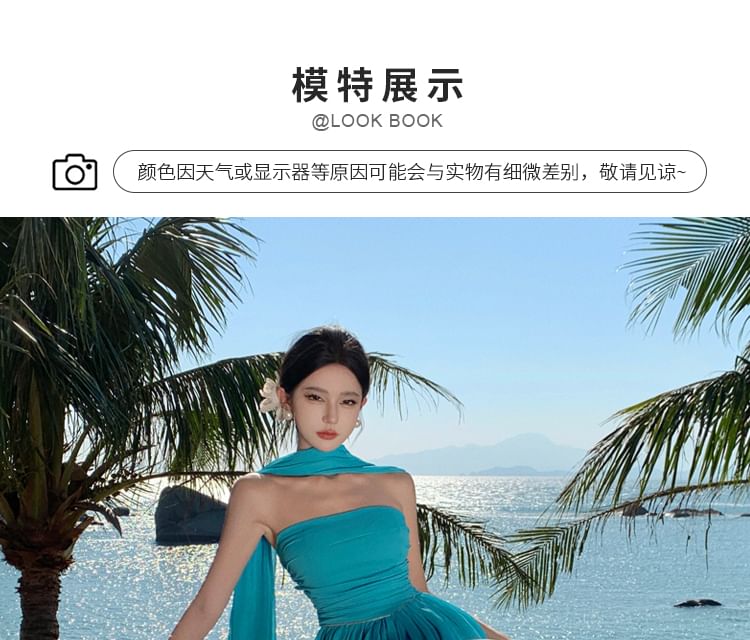 Choker-Neck Plain Shirred Midi A-Line Dress