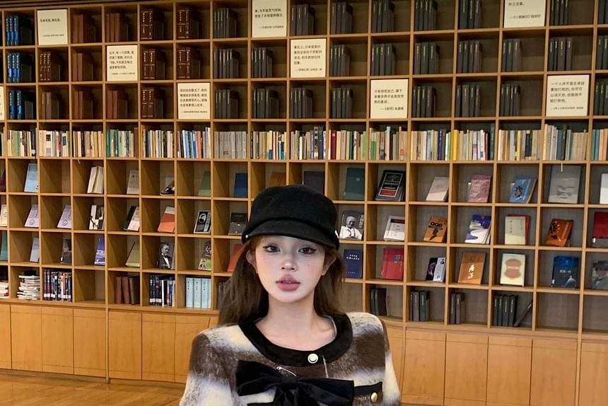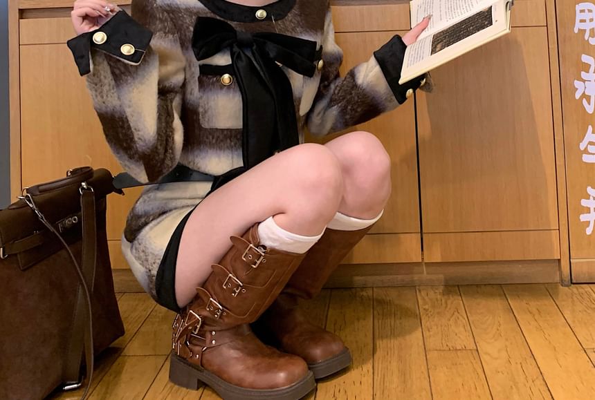 Crew Neck Plaid Bow Accent Contrast Trim Button-Up Crop Jacket / High Rise Mini Pencil Skirt