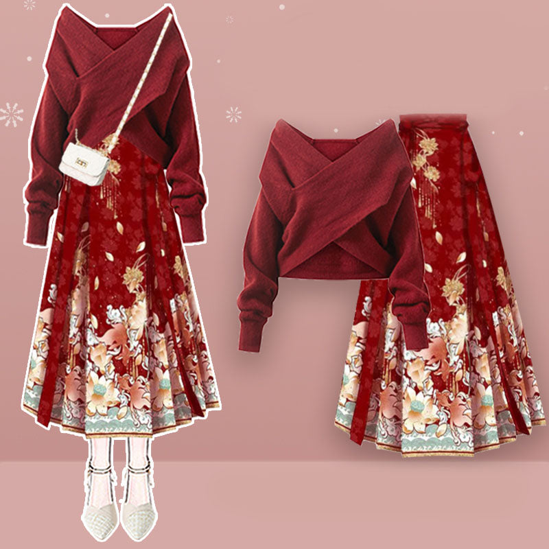Cross Knit Sweater Vintage Print Lace Up Pleated Skirt
