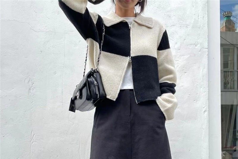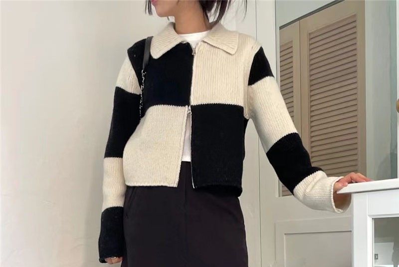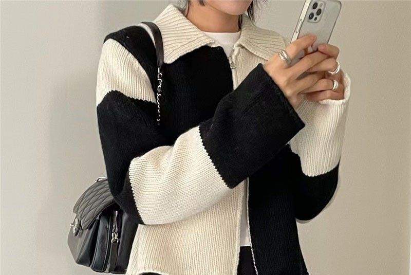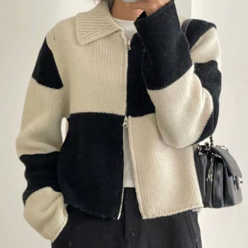 Double-Ended Zip Color Block Lattice Knit Cardigan
