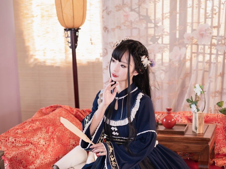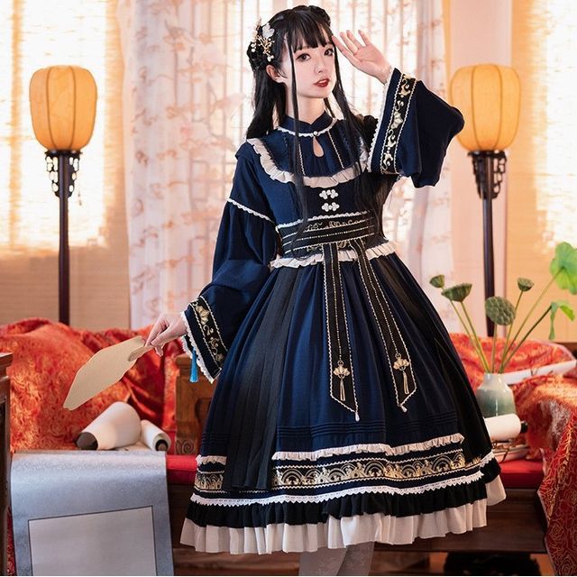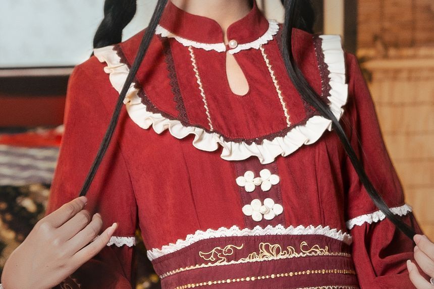 Lolita Flared-Sleeve Mock Neck Patterned Lace Trim Midi A-Line Dress / A-Line Skirt / Tights / Set