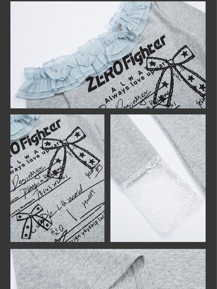 Grey Asymmetrical Neckline Lace Cuffs Top