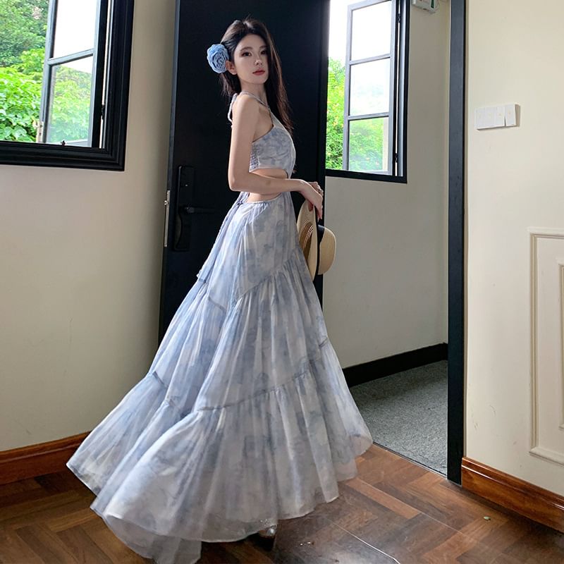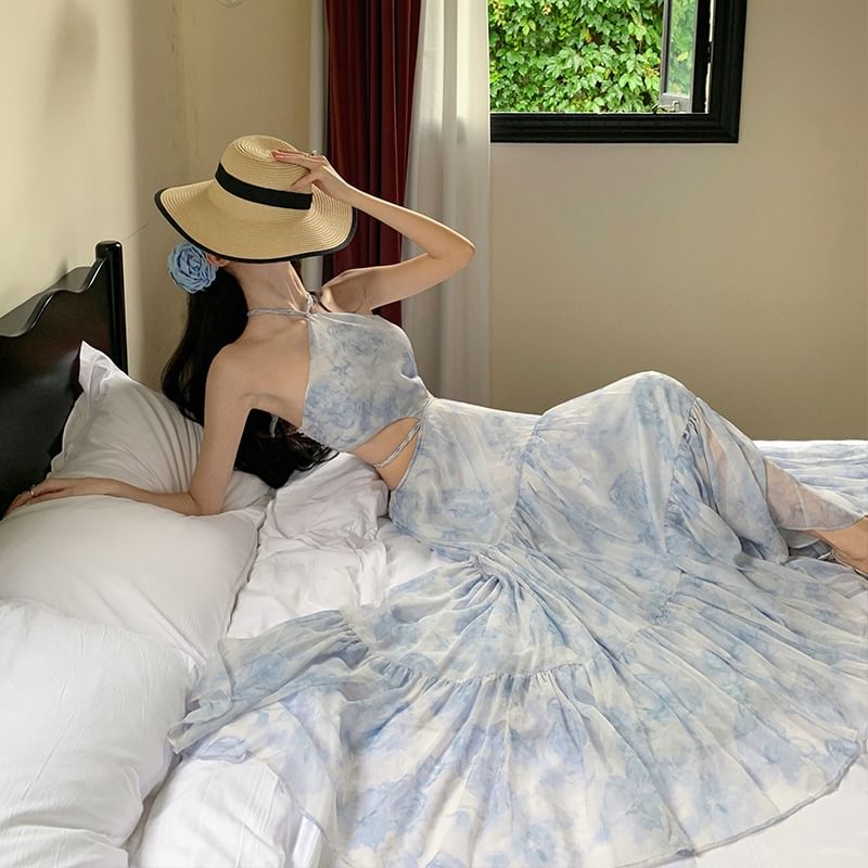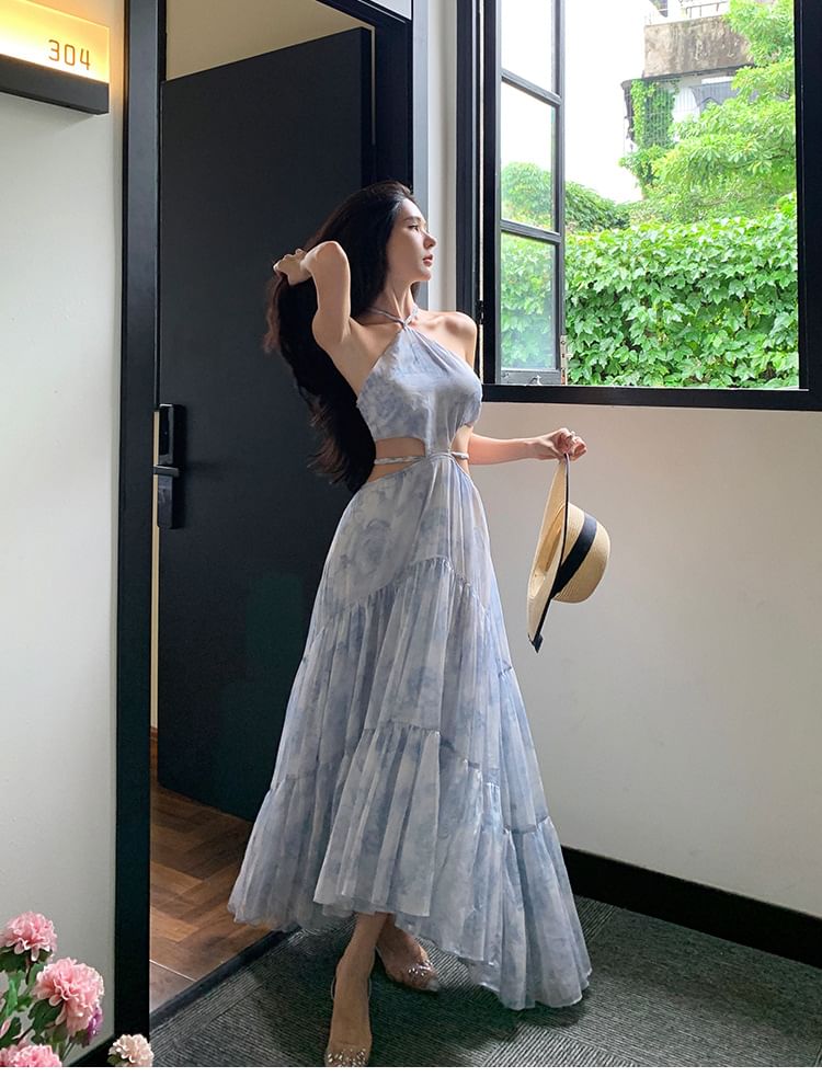 Halter Floral Cutout Maxi A-Line Dress