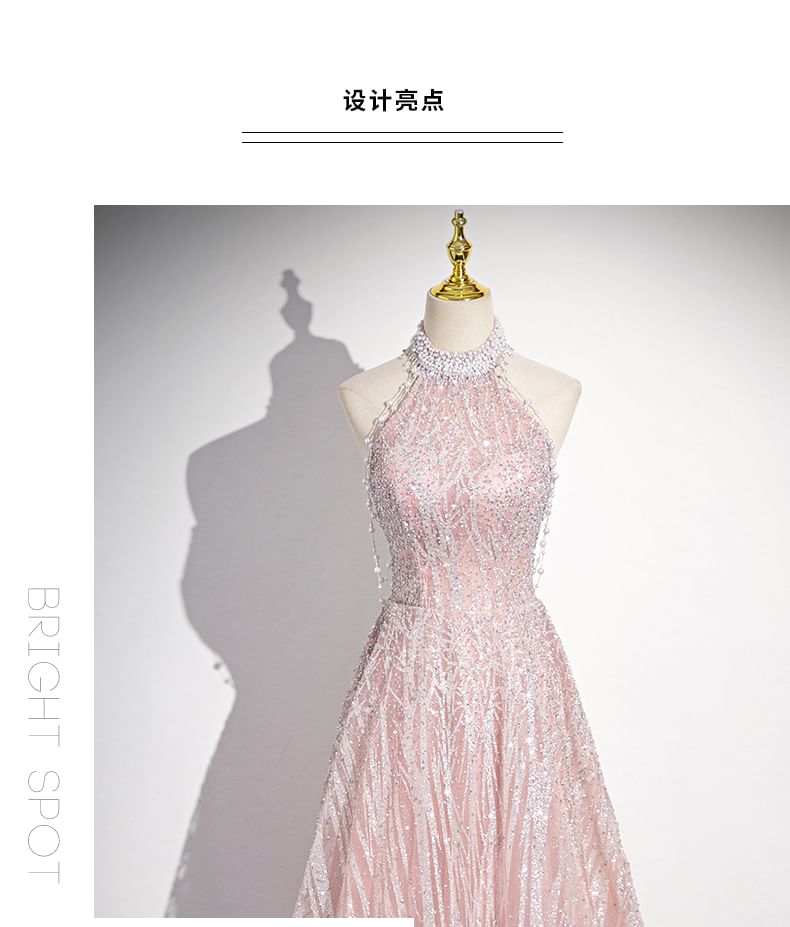Halter-Neck Floral Embroidered A-Line Evening Gown