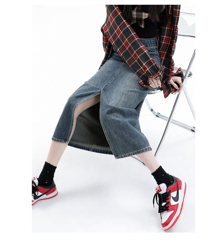 High Rise Slit Washed Denim Midi Pencil Skirt