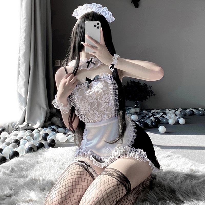 Unleash your inner seductive maid with our Kawaii Black Sexy Maid Lingerie Dress. Made with delicate see-through lace and a cute ruffled apron, this dress oozes elegance and sexiness. Perfect for a night of role-playing or just feeling your best in the bedroom.