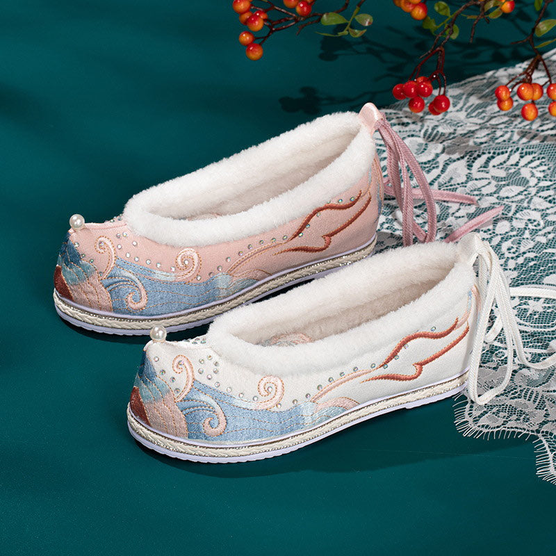Step into elegance with our Kawaii Embroidery Wave Pearl Fuzzy Trim Flats Shoes. These shoes feature intricate embroidery and delicate pearls, making every step a statement. The fuzzy trim adds a touch of luxury, while the flats provide comfort for all-day wear. Elevate your style with these unique and fashionable shoes.