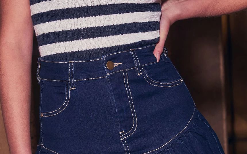 Long Skirt A-Line Jacket Washed / High Zip-Up Waist Denim Mini Cropped Sleeve
