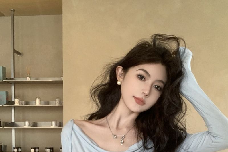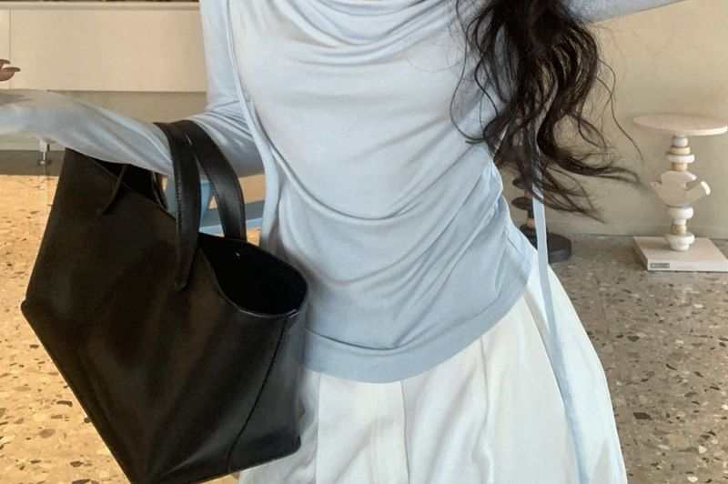 Long-Sleeve Cowl Neck Plain Slim Fit T-Shirt