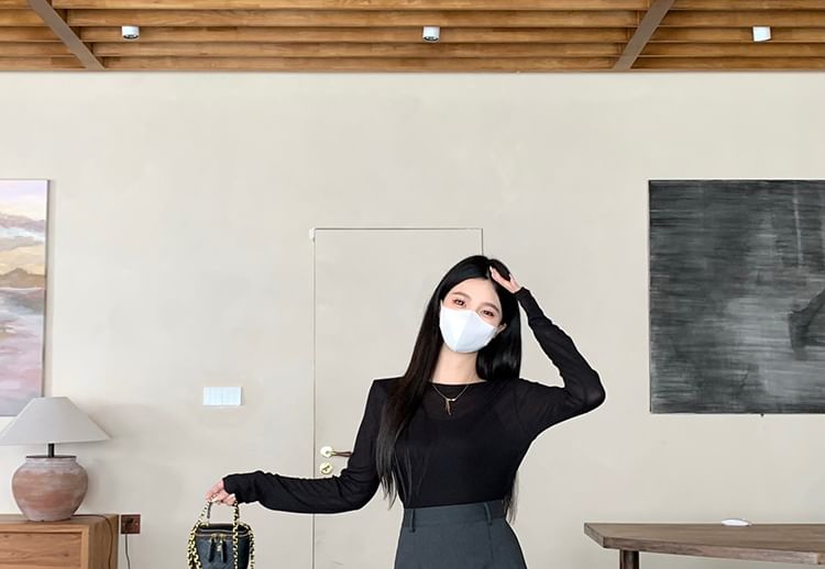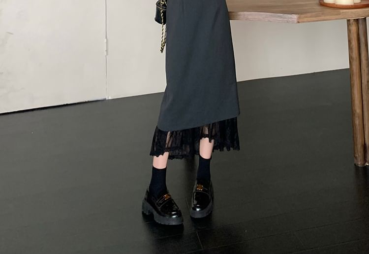 Long-Sleeve Crew Neck Plain Knit Top / High Rise Lace Trim Midi A-Line Skirt