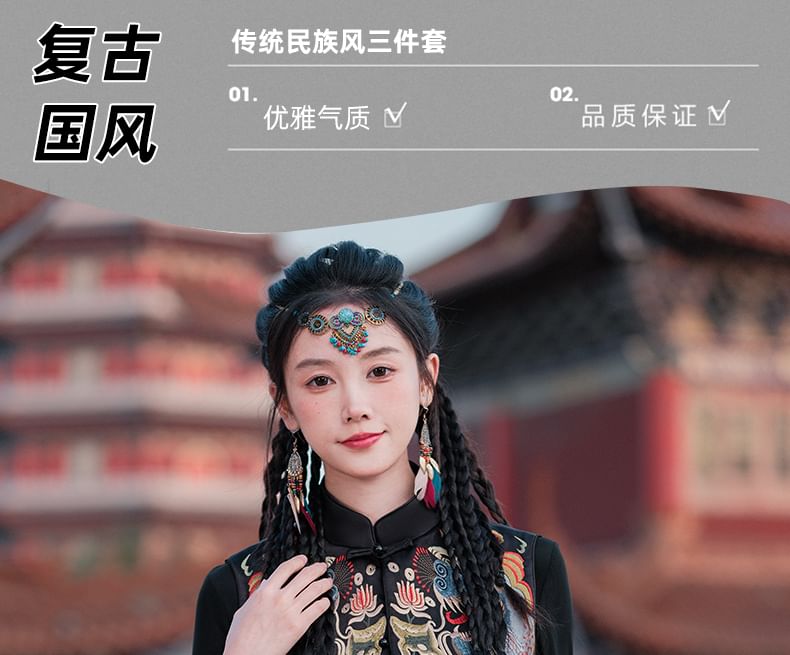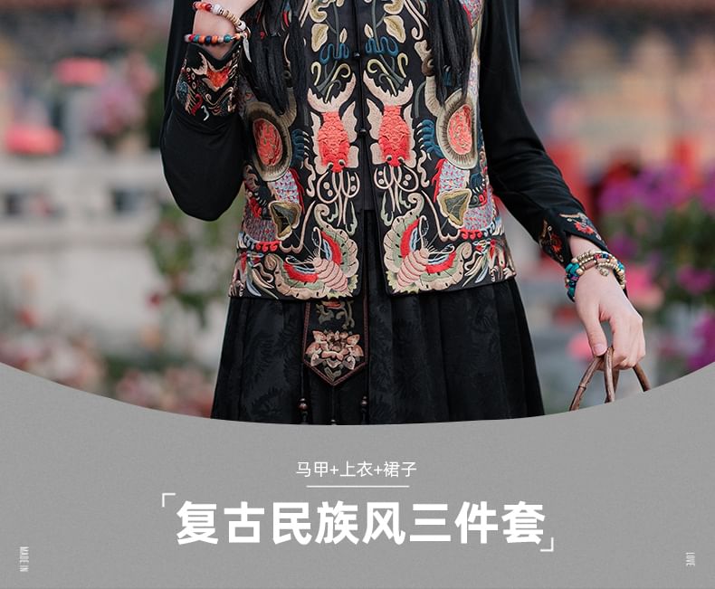Long-Sleeve Crew Neck Plain T-Shirt / Mid Rise Hanfu Floral Maxi A-Line Skirt / Patterned Vest