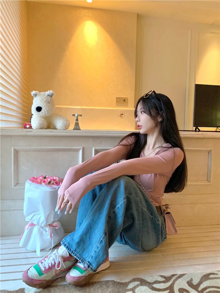 Long-Sleeve Crewneck Plain Crop T-Shirt