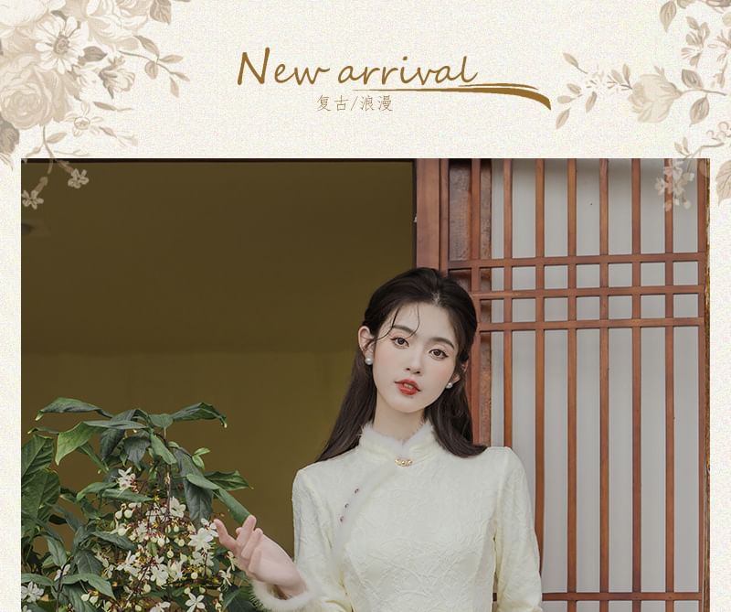 Long-Sleeve Floral Fluffy Trim Midi Mermaid Qipao