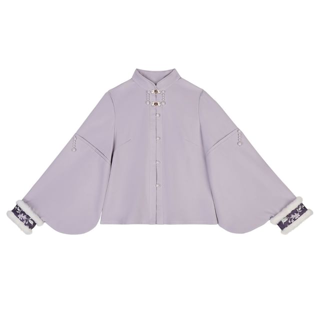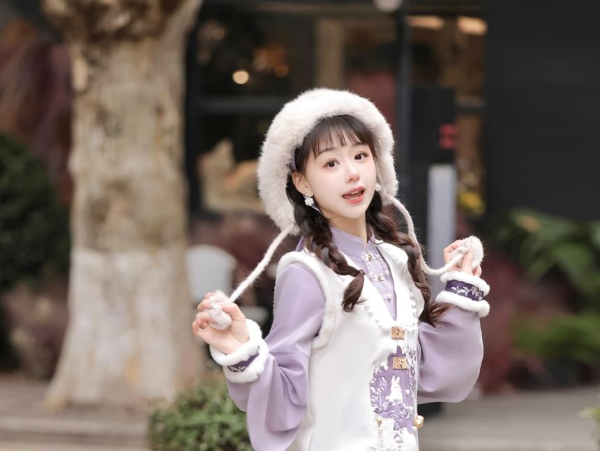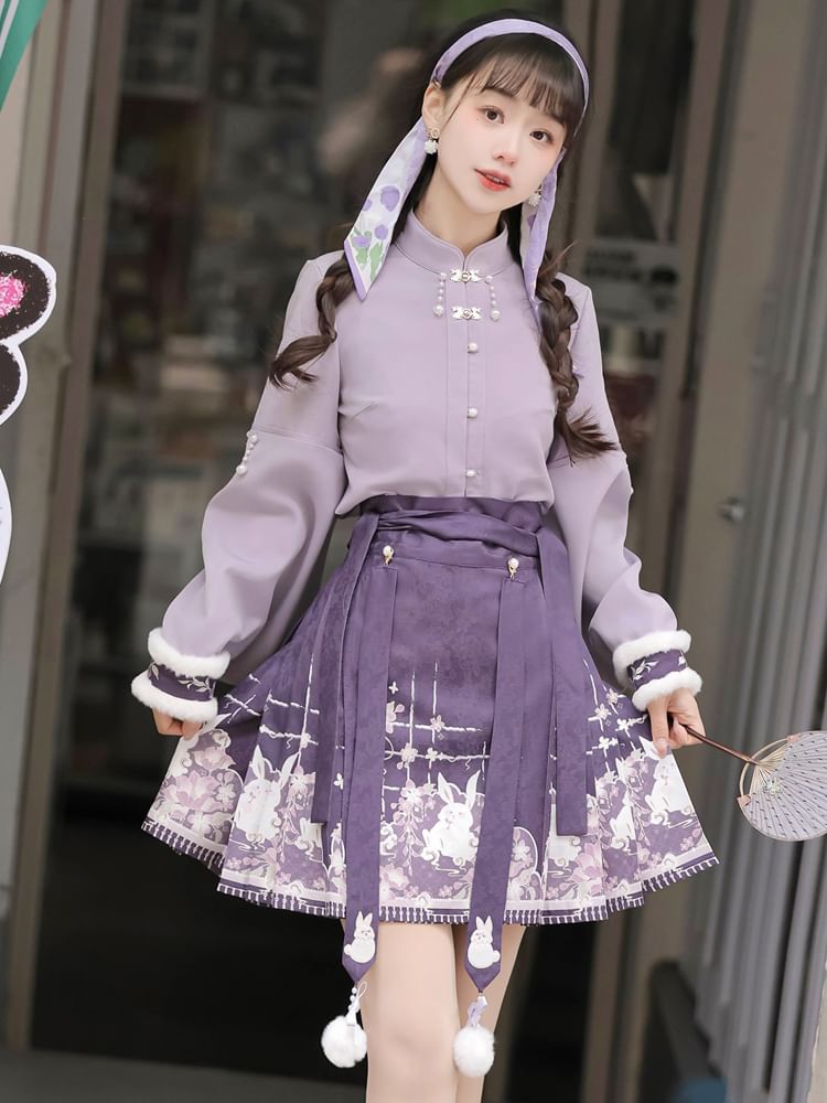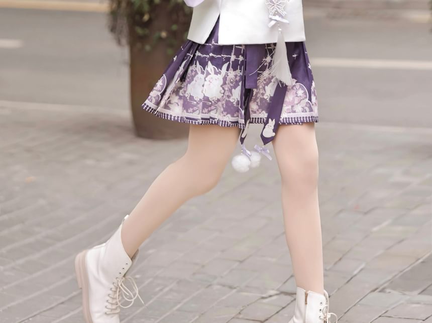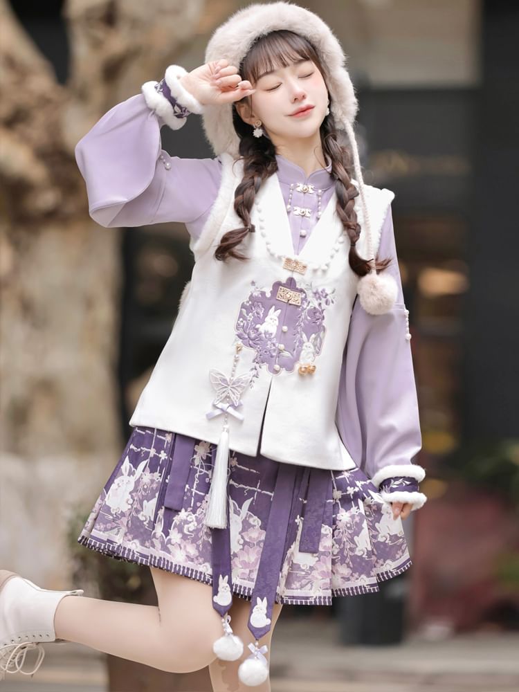 Long-Sleeve Mandarin Collar Floral Embroidered Fluffy Trim Blouse / V-Neck Rabbit Embroidered Faux Pearl Button Vest / High Waist Print Pleated Mini A-Line Skirt / Charm / Set