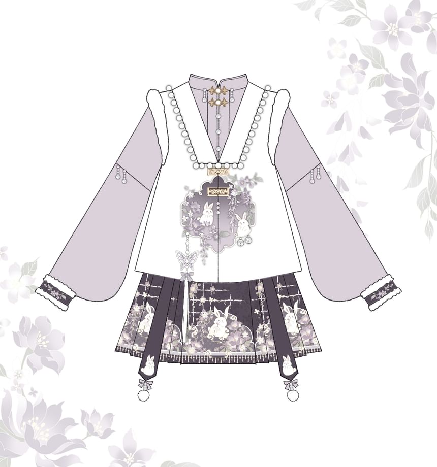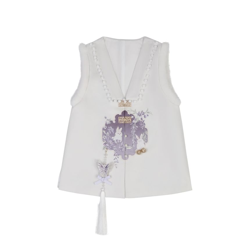 Long-Sleeve Mandarin Collar Lolita Floral Embroidered Fluffy Trim Blouse / V-Neck Rabbit Embroidered Faux Pearl Button Vest / High Waist Print Pleated Mini A-Line Skirt / Charm / Set