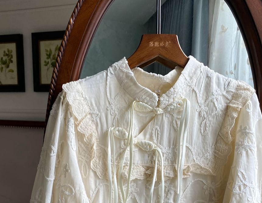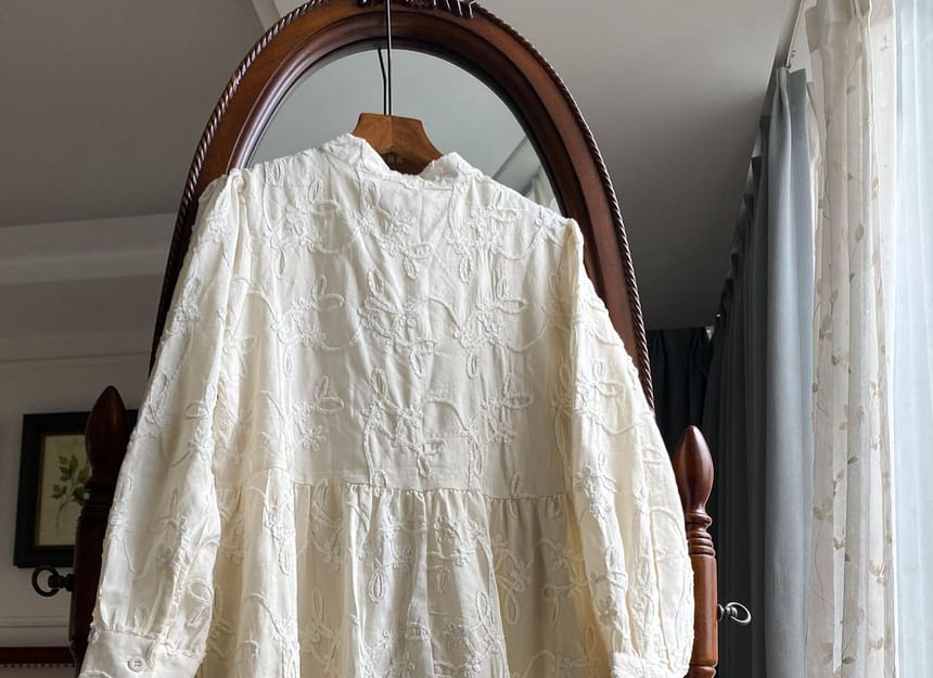 Long-Sleeve Mandarin Collar Plain Ruffle Frog Closure Midi A-Line Dress
