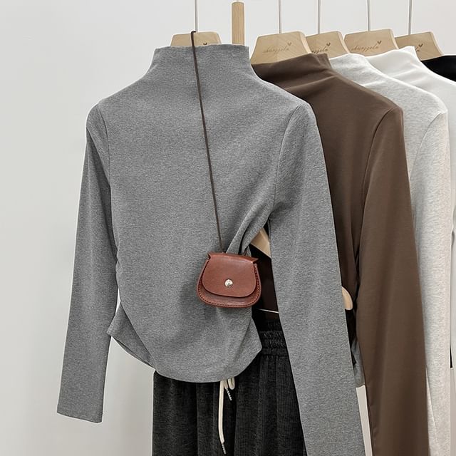 Long-Sleeve Mock Neck Bow Embroidered Ruched Slim Fit Crop T-Shirt