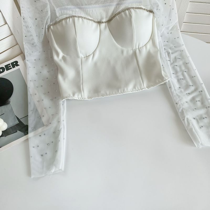 Long-Sleeve Mock Neck Rhinestone Mesh Panel Top