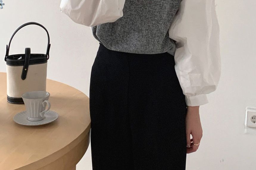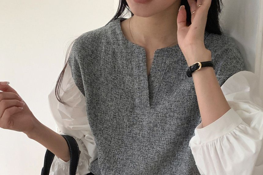 Long-Sleeve Notch Neck Melange Panel Blouse