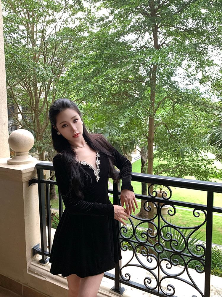 Long-Sleeve Off Shoulder Plain Rhinestone Velvet Mini A-Line Cocktail Dress