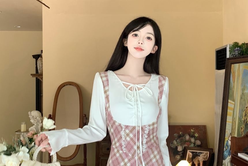Long Sleeve Round Neck Plaid Mock Two Piece A-Line Midi Dress