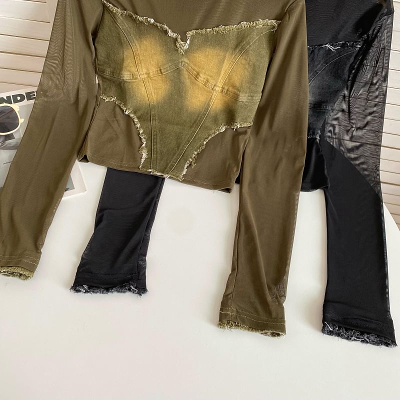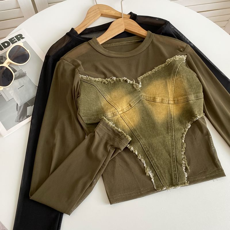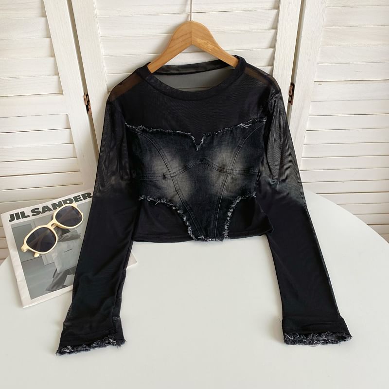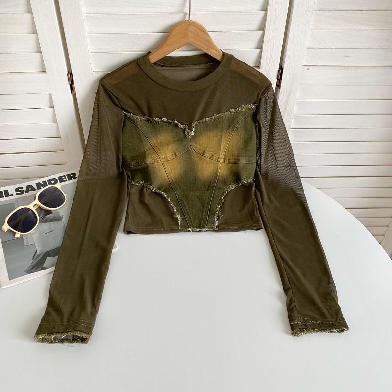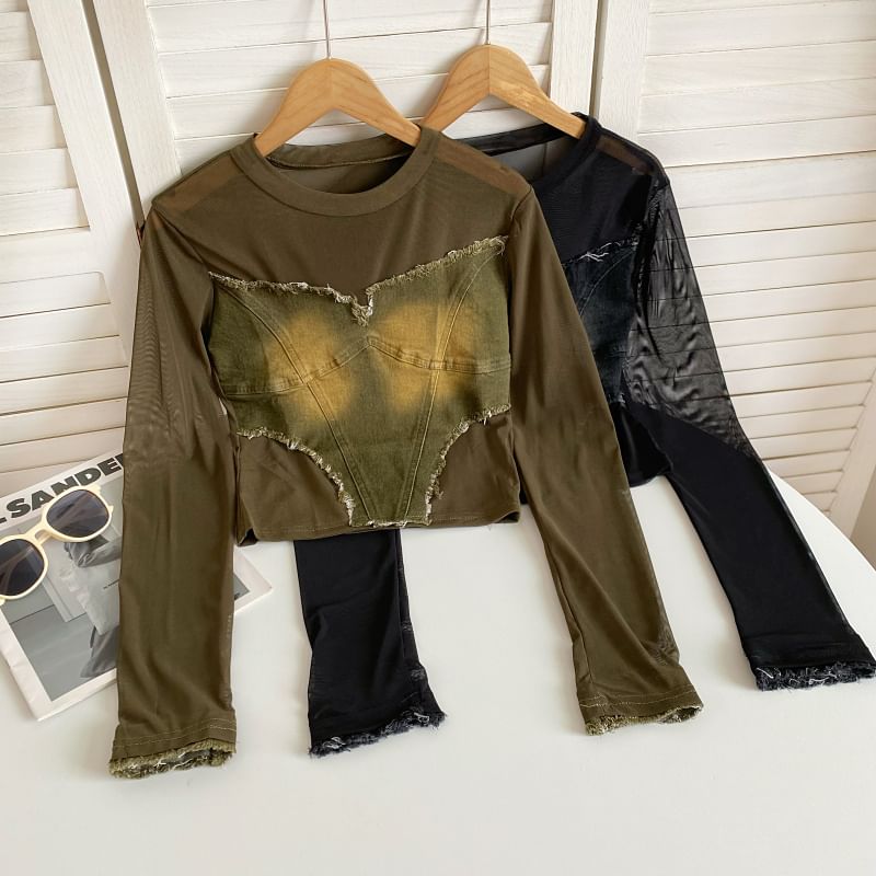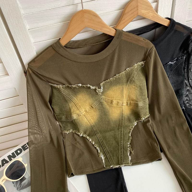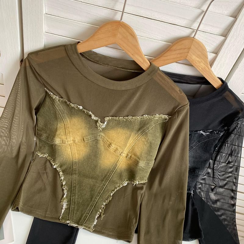 Long-Sleeve Round Neck Plain Denim Applique Tee