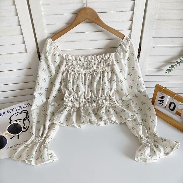 Long-Sleeve Square Neck Floral Print Ruched Ruffle Top