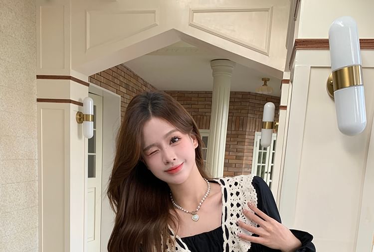 Long Sleeve Square Neck Lace Panel Midi A-Line Dress