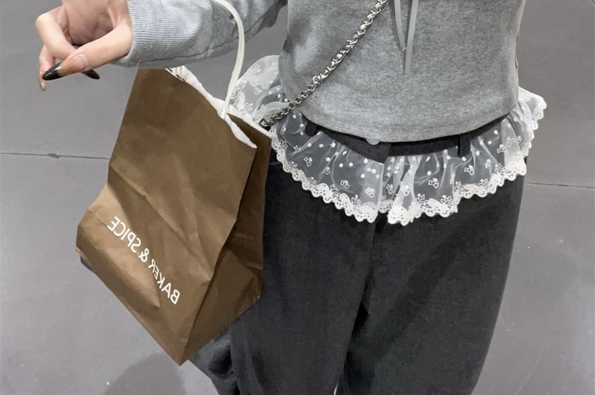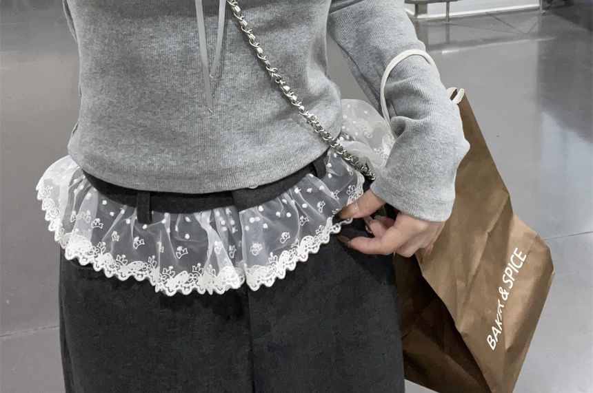 Long-Sleeve V-Neck Plain Lace Trim Tie Front Slim Fit Crop T-Shirt
