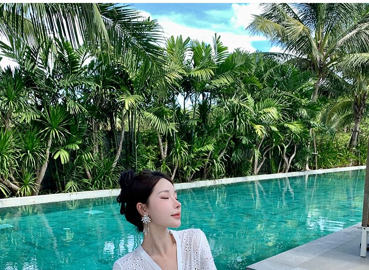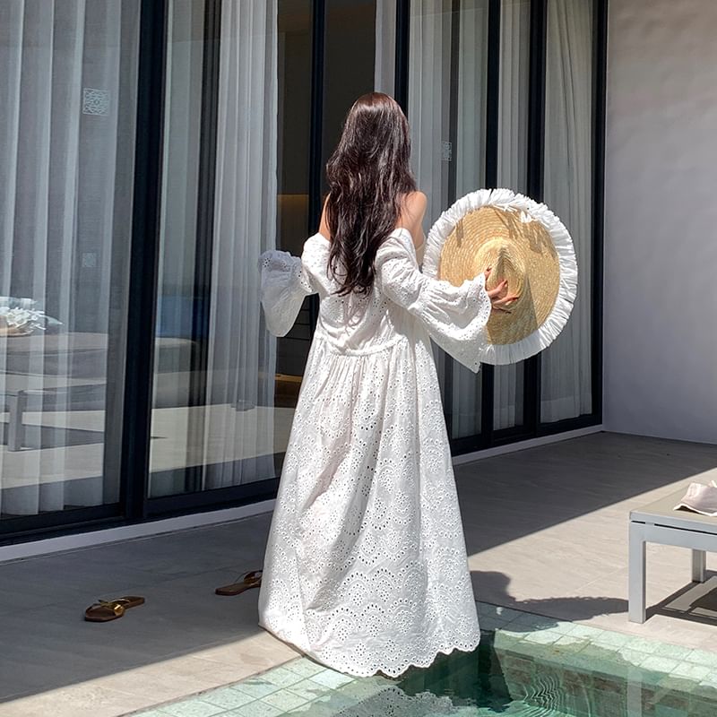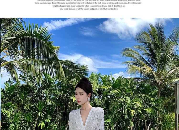 Long-Sleeve V-Neck Plain Slit Midi A-Line Eyelet Lace Dress