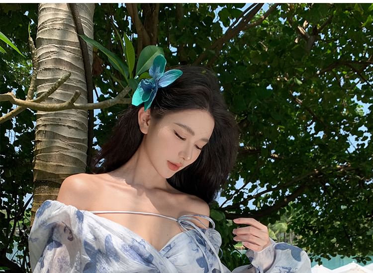 Long-Sleeve V-Neck Print Maxi A-Line Dress